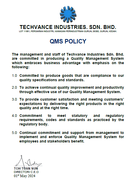 The management and staff of Techvance Industries Sdn. Bhd. are committed to producing a Quality Management System that embraces business advantages, with emphasis on the listed points: